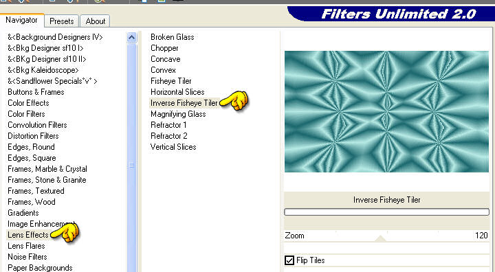 Inverse Fisheye Tiler/ Zoom 120/ Flip Tiles marcado.