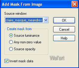 12- Abra a mask Claire_masque_meandres e minimize no psp. 13- Layers/ New Mask Layer/ From Image. 14- Na janelinha que abrir clique na setinha e procure pela mask / Invert Mask data clicado de OK.